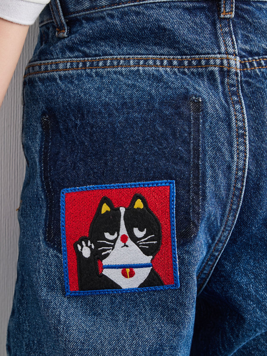 Когда мы думаем о джинсах, то, как правило, представляем себе классику — простой и удобный элемент гардероба, который всегда в тренде. Однако, если взглянуть внимательнее, даже такой привычный предмет одежды может стать центром внимания, если учесть современные модные детали и акценты. Вот несколько примеров джинсов, которые не просто сидят на фигуре, но и придают образу яркость и индивидуальность. 1. Уникальные акценты на карманах Одним из самых заметных трендов стали джинсы с яркими и необычными карманами. Например, джинсы с крупным патчем на заднем кармане. Этот элемент, как на представленных моделях, добавляет в образ игривости и оригинальности. Вышивка с забавным котом, которая легко привлекает взгляд, придает образу неформальности и стиля. 2. Переосмысленные классические фасоны Многие бренды любят играть с классическими силуэтами. Примером может служить широкие джинсы с низкой посадкой, которые идеально сочетаются с удобной обувью и стильной верхней одеждой. Здесь важны не т