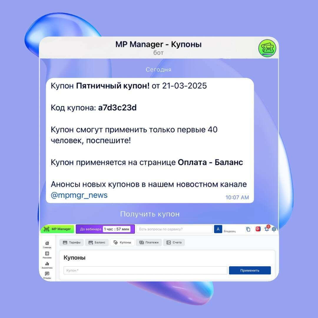 🎁 Пятница = Подарки от MP Manager! Забирайте новый купон на 250₽ прямо сейчас — он уже ждёт вас в нашем боте 👉 @mpmgr_coupons_bot Как работает: — Купон добавит +250₽ к вашему балансу в MP Manager — Без оплат, подписок или условий — просто подарок! — Успеют только первые 40 человек, дальше — всё 📍 Где применить: Теперь купоны активируются в 2 клика: Страница “Оплата” → Вкладка “Купоны” (см. скрин) ⚡️ Новый купон — каждую пятницу Сделайте привычкой начинать выходные с приятного бонуса от MP Manager! #Купон
