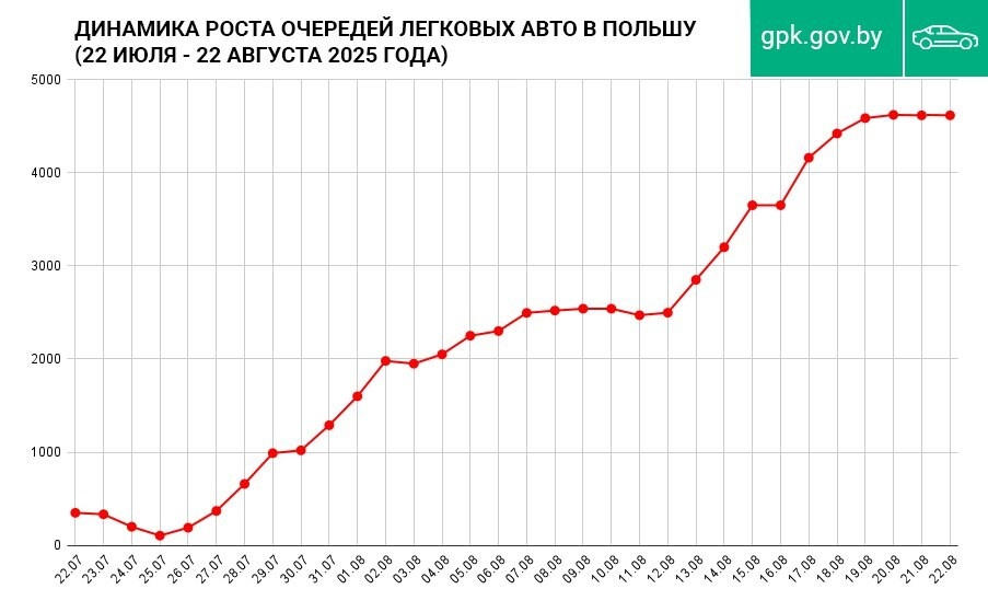 Очередь легковых авто на въезд в Польшу за месяц выросла в 13 раз. Такой статистикой поделились в Госпогранкомитете. Инфографика: t.me/gpkgovby Перед пунктом пропуска «Тересполь» («Брест») с 22 июля скопление авто увеличилось с 350 до 4 630 единиц. Несмотря на огромное количество легкового транспорта, в течение всего месяца сопредельная сторона оформляла в среднем 34% машин от нормы, отметили в белорусском ведомстве. В ГПК также подчеркнули, что при этом «Тересполь» остаётся единственным погранпереходом, доступным для следования в Польшу легкового транспорта и автобусов. «Уже вторые сутки пошли, как мы тут кукуем». Что происходит в огромной очереди автобусов на выезд из Бреста в Польшу Граждане Беларуси и стран Евросоюза, в том числе Польши, вынуждены находиться в очереди на границе около семи дней. По состоянию на 12:00 22 августа в данном КПП зафиксировано 4 630 легковушек и 115 автобусов. Фото: архив av.by