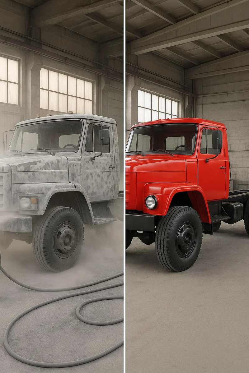 Когда кузов грузовика теряет внешний вид, покрывается ржавчиной и сколами — это не конец. Всё можно восстановить, и самый эффективный способ — пескоструйная обработка + покраска.