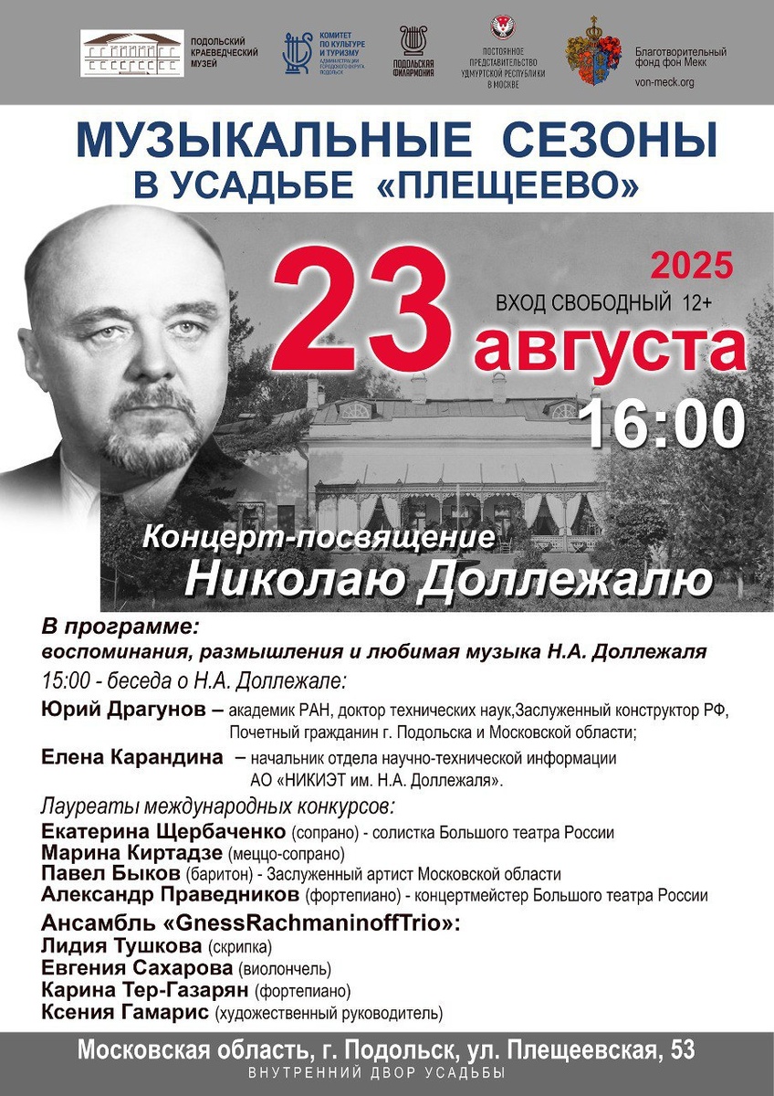 ✨ Музыкальный сезон в усадьбе Плещеево 🎧В концерте прозвучит музыка любимых композиторов Николая Доллежаля, а также его воспоминания и размышления. 👉 В 15:00 состоится беседа о Николае Доллежале. 🖼️Также с 14:30 будет открыта выставка, посвященная жизни великого конструктора. 🚫 Возраст: 12+ 📆 23.08.2025 🕒 16:00 🏢 Усадьба "Плещеево" 📍 г. Подольск, ул. Плещеевская, 53 💰 Вход свободный❗️ #webПодольск ⭐Разместить публикацию ⭐Поддержать канал голосом 💰 Стань курьером в Подольске – твой доход, твое время! ✅ Мероприятия Подольск https://dzen.ru/id/66ed500f7b5671493eca3fd6 http://vk.com/podolsk_events http://dzen.ru/podolsk_events