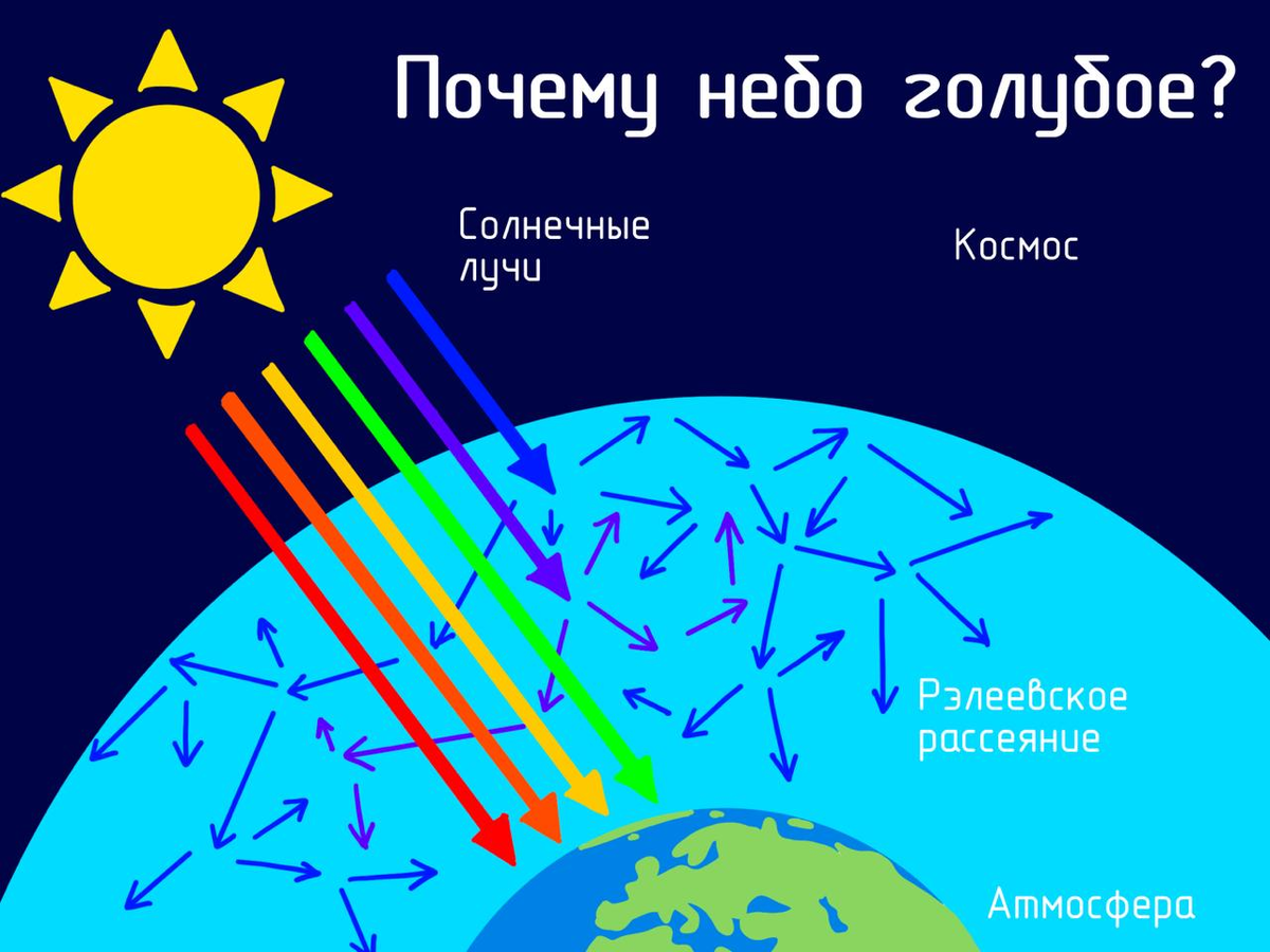 Солнечный свет, который кажется нам белым, на самом деле является смесью всех цветов радуги (спектра), каждый из которых соответствует определенной длине волны. Более длинные волны мы воспринимаем как красный и оранжевый цвета, а более короткие — как синий, голубой и фиолетовый Когда этот луч света устремляется к Земле, он сталкивается с препятствиями — молекулами газов воздуха (в основном азота и кислорода), а также с мельчайшими частицами пыли. Именно это взаимодействие и называется рассеянием Рэлеевское рассеяние — это избирательное рассеяние света на частицах, размер которых значительно меньше длины световой волны (как молекулы газов в атмосфере) Главный принцип этого эффекта заключается в следующем: интенсивность рассеяния света обратно пропорциональна четвертой степени длины его волны. Это означает, что: Коротковолновое излучение (фиолетовый, синий, голубой свет) рассеивается в десятки раз сильнее, чем длинноволновое (красный, оранжевый свет). Например, длина волны синего света (