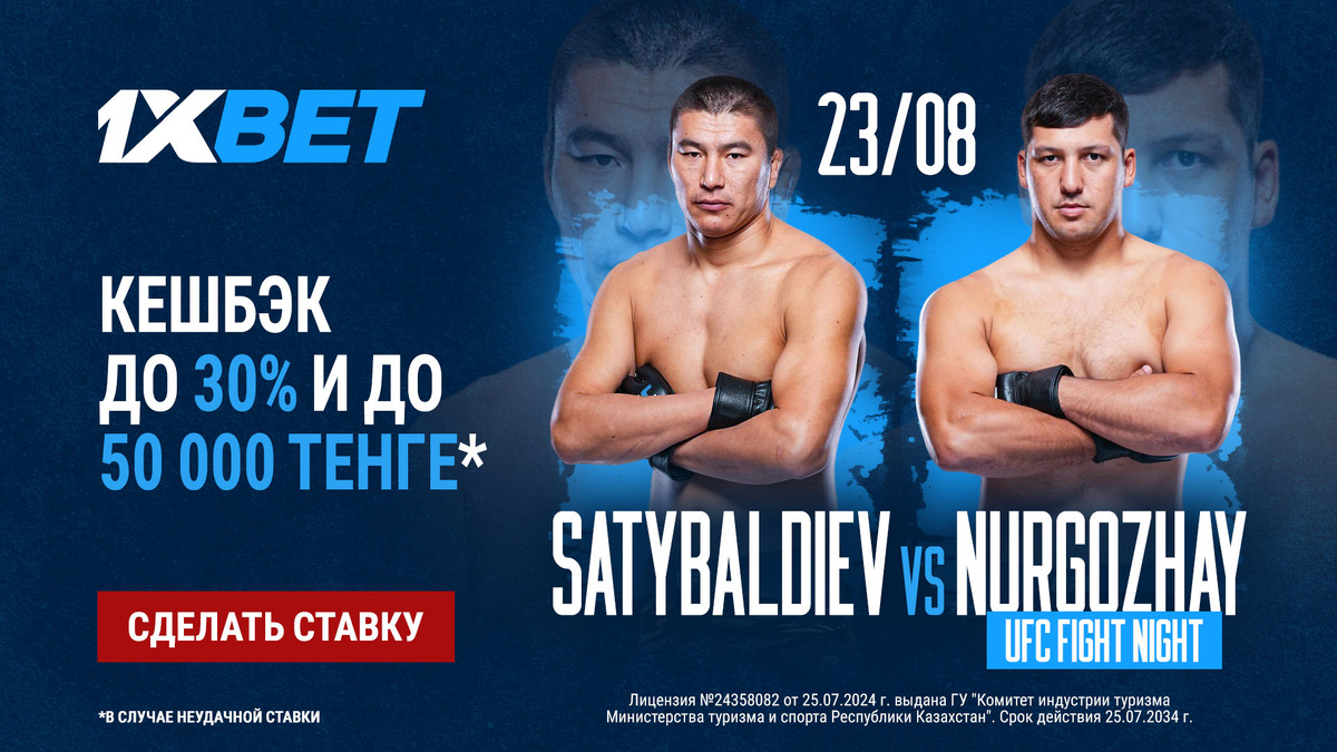 Компания 1XBET предлагает поддержать своего фаворита и получить до 50 000 тенге и кэшбэк до 30% в случае проигрыша.