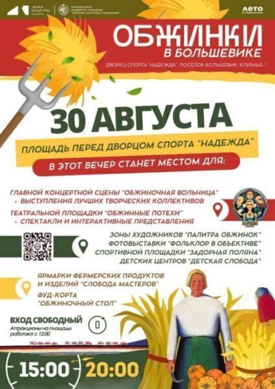 Ежегодный народный фестиваль «Обжинки» состоится в Серпухове 30 августа площадь перед Дворцом спорта «Надежда» на несколько часов превратится в яркую площадку для грандиозного ежегодного народного праздника. На всех площадках гостей ждут розыгрыши подарков, выступления лучших творческих коллективов Серпухова и Московской области; уличные спектакли по мотивам народных сказок и былин. Почитатели искусства оценят выставки картин и изделий декоративно-прикладного искусства; поклонников рукоделия всех возрастов пригласят на мастер-классы. Для мальчишек и девчонок откроется зона активных игр, анимационных программ и молодецких забав. Самым вкусным моментом фестиваля станут изобильные угощения. Выбирайте на свой вкус: ароматная выпечка, шашлык, блины с разными начинками; освежающие напитки, травяные чаи, фермерское мороженое. Можно устроить пикник на свежем воздухе в теплой компании! Приходите всей семьей 30 августа в 15.00: Г.о. Серпухов, п. Большевик, площадь перед Дворцом спорта «Наде