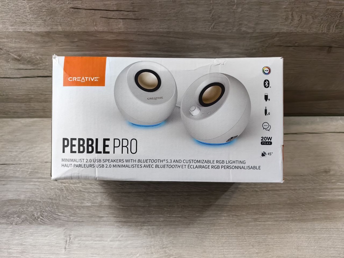 Компания Creative давно закрепилась на рынке доступной акустики для ПК и ноутбуков. Серия Pebble полюбилась пользователям за компактный размер и отличное качество звука. В новой модели Creative Pebble Pro производитель сделал акцент на мощности, удобстве и визуальных эффектах. Колонки получили RGB-подсветку, улучшенный звук и возможность подключения гарнитуры и микрофона. Всё это делает их особенно интересными для геймеров и стримеров. Creative Pebble Pro сохранили узнаваемый фирменный облик серии — округлую форму с динамиками под углом 45 градусов, благодаря чему звук направлен прямо к слушателю. В этой версии появились аккуратные RGB-кольца у основания, которые добавляют современный акцент, а подставки стали мягче и устойчивее. Колонки доступны в разных вариантах, и у нас — именно в белом цвете. Такое оформление выглядит свежо и современно, отлично вписывается в светлый интерьер и делает подсветку ещё более выразительной. Комплектация приятно удивляет. В коробке, помимо самих колонок