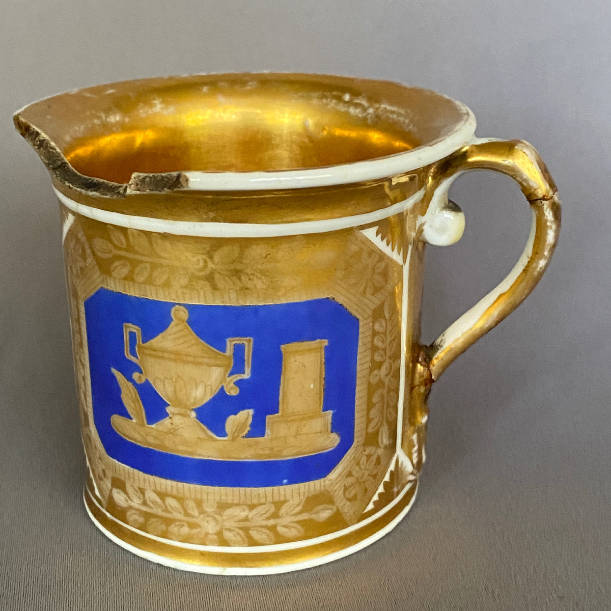 Да, венчик здесь отколот, ручка склеена, но это не уменьшает её коллекционной ценности: перед нами редкий пример сложного декоративного фарфора эпохи ампира, переживший два века и сохранивший золотое сияние и тонкость работы.