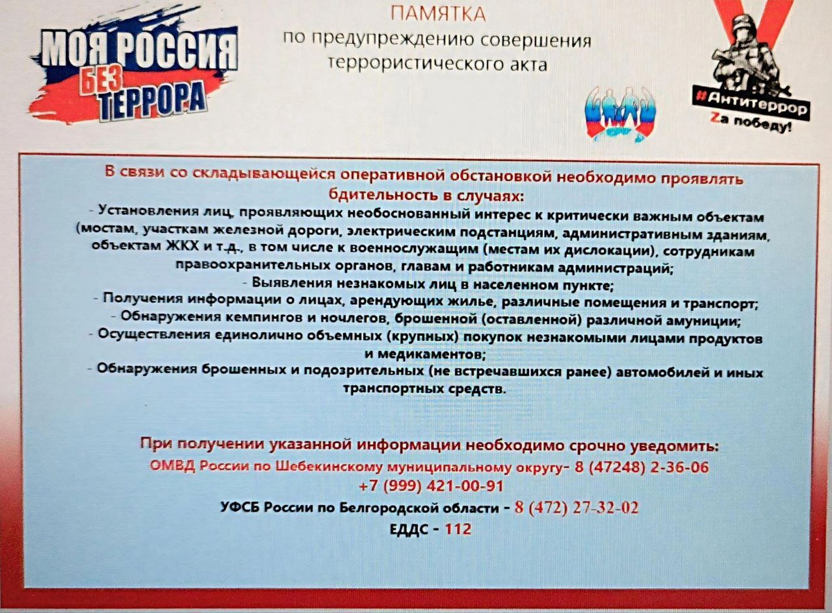 Фотографировать мурал можно, военных и инфраструктуру - нельзя Проявляйте бдительность и немедленно сообщайте, если заметите: · Проявляют подозрительный интерес к критическим объектам (мосты, ж/д, электростанции, административные здания), военным или силовикам в т.ч. в интернете. · незнакомцы в населенном пункте, арендующих жилье, помещения или транспорт. · Стихийные лагеря, брошенное снаряжение или автомобили. · Крупные покупки продуктов и медикаментов незнакомыми людьми. Телефоны для сообщения: · Полиция: 8 (47248) 2-36-06, +7 (999) 421-00-91 · УФСБ: 8 (4722) 27-32-02 · ЕДДС: 112