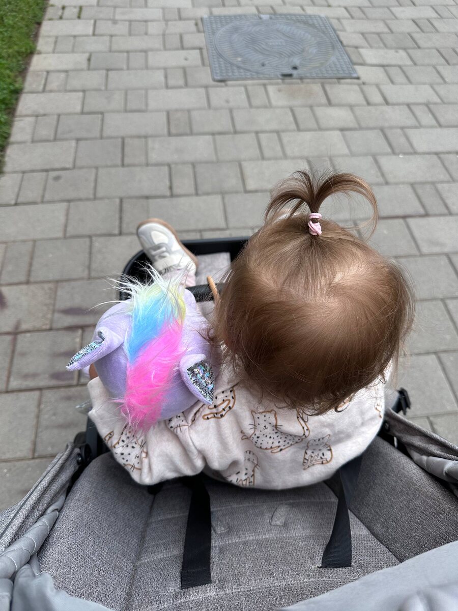 И на прогулку теперь игрушки тащит и спит с ними))