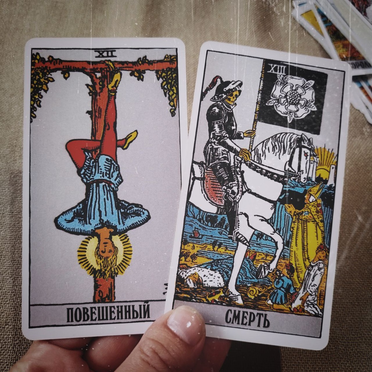 Добрый день, мои прекрасные🎀 Вернёмся к Повешенному и Смерти. Мы видим, что Повешенный висит вниз головой. Если вы когда-нибудь находились в похожей позе, то вспомните, что окружающая действительность, насколько бы привычной и знакомой она ни была, выглядит иначе. ✨Это первый важный момент в процессе трансформации - необходимо посмотеть на свой привычный мир иначе, с другой стороны, с противоположной или отличной точки зрения. ✨Второй момент. Здесь задействовано тело. Персонаж не просто мыслями своими думает иначе. А всё тело его находится в отличном от обычного положении. Попробуйте повисеть так - кровь от ног уйдёт в голову, ноги онемеют, голова будет болеть, начнётся тошнота, изжога. То есть тело неизбежно участвует в трансформации сознания. Наверняка вы замечали, что изменения в теле влекут за собой изменения в мыслях: поправилась - настроение падает, самооценка тоже; похудела - настроение и самооценка повышаются; сделала другую причёску - состояние меняется; попробовала новую