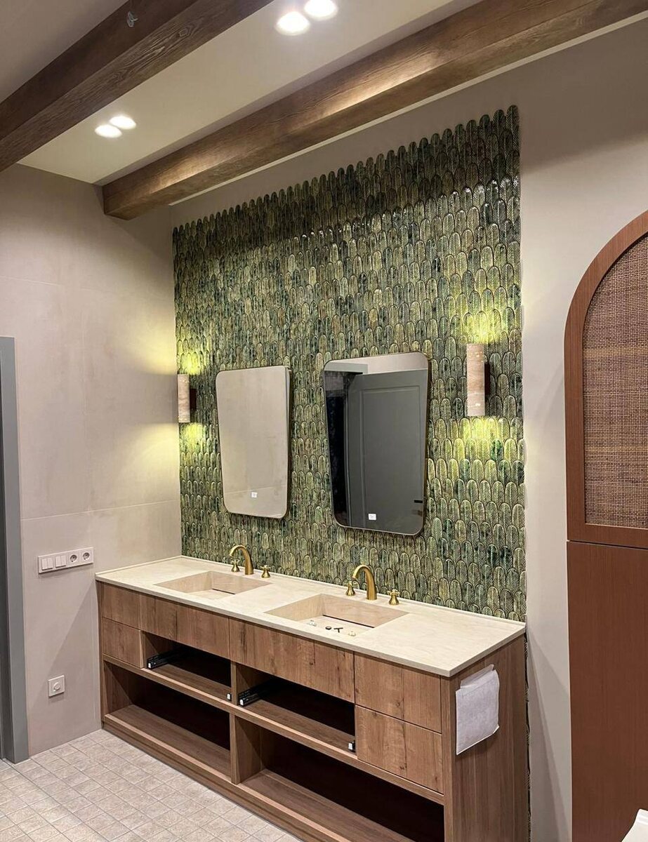 Каждый проект ПентаКерамики — это не просто заказ, а настоящее творение, итог совместной работы и вдохновения. Недавно дизайнер Венера Терегулова обратилась к нам с просьбой создать плитку для уютного коттеджа в живописном поселке Малые Бережки, расположенном в Московской области. Стремясь создать атмосферу гармонии и уюта, Венера пришла к нам в офис, чтобы лично подобрать идеальные оттенки для своего замысла. Вместе мы подобрали уникальный микс из зеленых тонов коллекции Фикус, который призван подчеркнуть детали оформления, выполненные из дерева и золота.