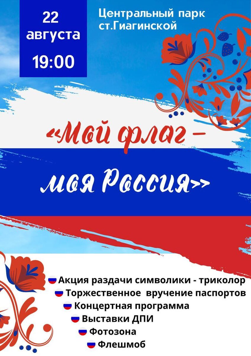 Сегодня в России отмечается День Государственного флага Российской Федерации Дорогие жители и гости Гиагинского района, приглашаем вас вместе отметить этот праздник в Центральном парке ст.Гиагинской.