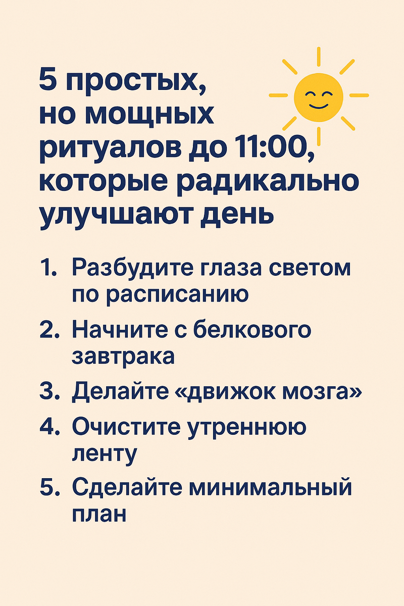Утренний ритуал решает весь день. Но не менее важно, что вы делаете до 11:00 — именно в это время мозг особенно восприимчив и формирует настроение и продуктивность на остаток суток. Попробуйте эти пять привычек — и вы заметите разницу уже через неделю: 1. Разбудите глаза светом по расписанию Не заставляйте организм «загораь» кофе. Включите свет (в идеале тёплый) в 7:30 или сразу после пробуждения. Свет запускает биоритмы, помогает быстрее включиться. 2. Начните с белкового завтрака Овсянка с орехами, омлет, творог — белок помогает избежать резких падений энергии. Важно сделать это в первые 30 минут после пробуждения. 3. Делайте «движок мозга» 5 минут решения головоломок или изучения новой фразы на иностранном — и вы уже более осознанны. Это запускает ментальный фокус на весь день. 4. Очистите утреннюю ленту Не листайте соцсети до 11:00. Первая информация — диктует тон. Лучше прочитать вдохновляющую цитату или пару страниц качественной книги. 5. Сделайте мин