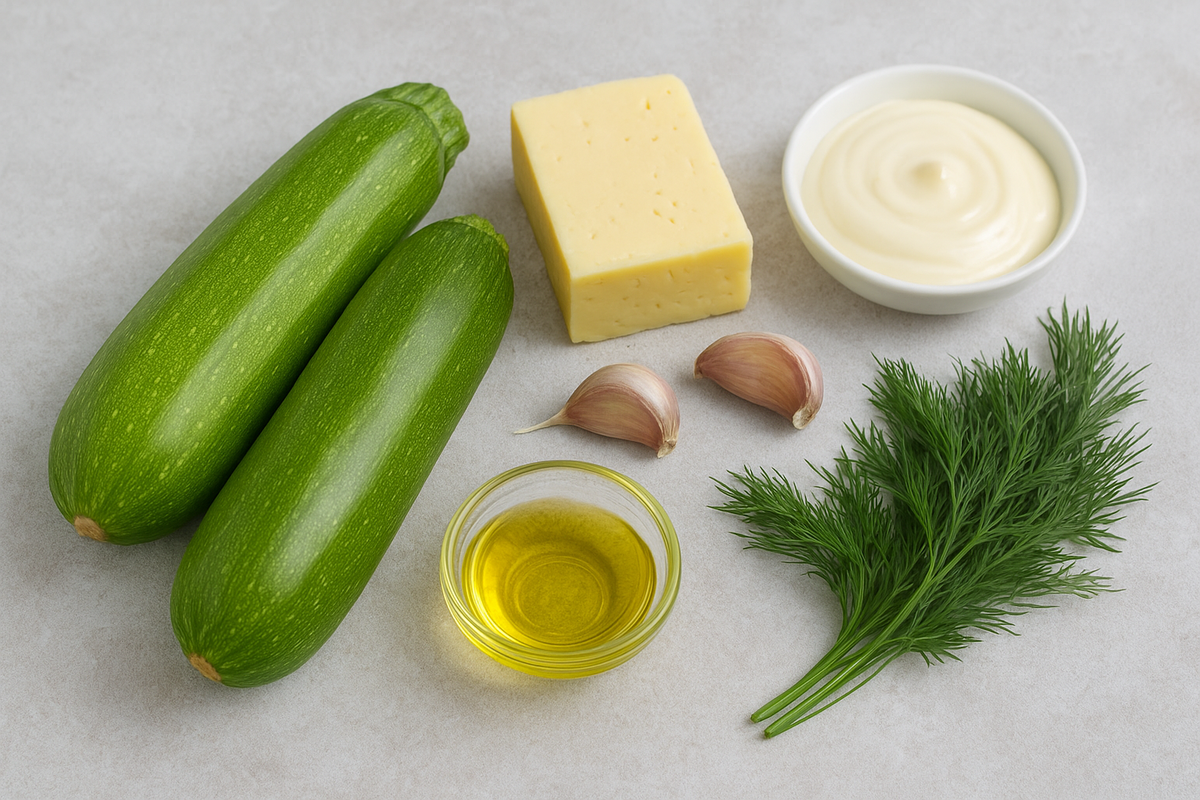 2 маленьких цукини; 60–80 г полутвёрдого сыра; 2 ст. л. майонеза; 1–2 зубчика чеснока; несколько веточек укропа; соль; растительное масло для жарки.