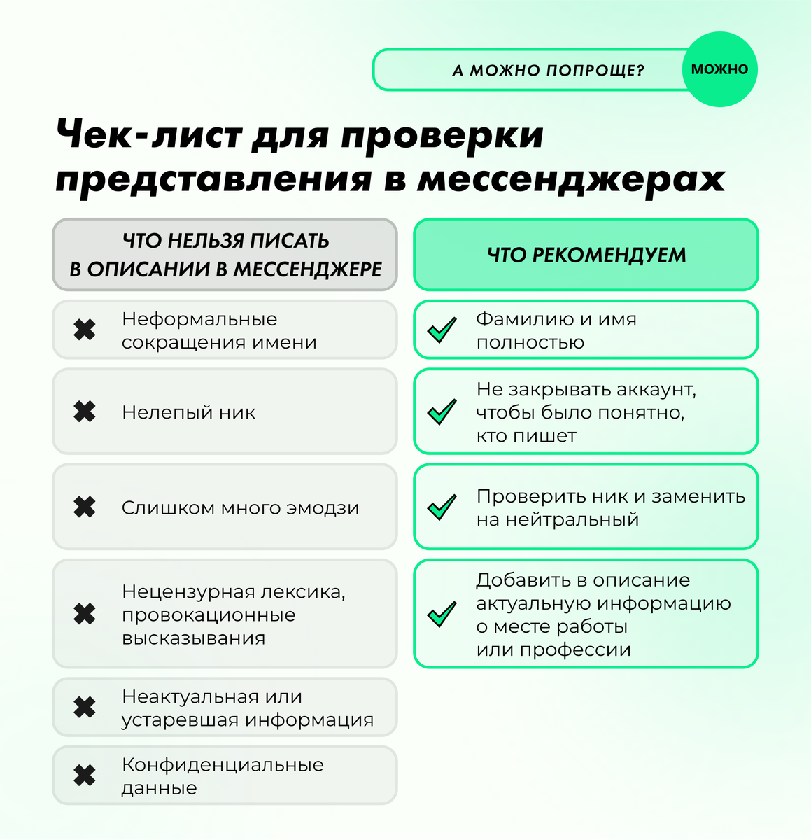 Проверьте свой профиль и представление в мессенджерах. Если у вас профиль для рабочей коммуникации, вы направляете с него официальные запросы, состоите в рабочих и тематических чатах — проверьте, как вы там называетесь. Официальные представители, пиарщики и эксперты названы часто аббревиатурами, инициалами или непереводимой игрой слов. Пишет руководитель направления или эксперт — и называется там Brave_GTA или September25. Присылает пиарщик пресс-релиз — и даже неловко спрашивать, как обращаться. В профиле стоит просто А А или еще интереснее — вместо имени многоточие. Или организатор конференции — хорошо если это просто Nata T. Но ведь бывает и Катечка, Mister Ikota или Natusik_the_best. Иногда из лучших побуждений профиль называют по специальности — Ваш риелтор. Но как потом вас искать? И как к вам обращаться? Победитель в номинации странных представлений — Любимая_жена. И нет, это не из личных контактов ее мужа. Это так человек назвал себя в мессенджере по умолчанию и теперь в чатах