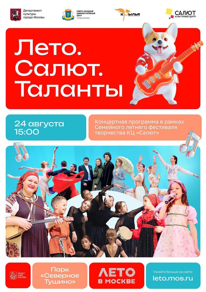 КУЛЬТУРНЫЙ ЦЕНТР «САЛЮТ» ОТКРЫВАЕТ 60-Й ЮБИЛЕЙНЫЙ ТВОРЧЕСКИЙ СЕЗОН В ПАРКЕ СЕВЕРНОЕ ТУШИНО! Приглашаем вас на яркое и незабываемое событие — фестиваль ЛЕТО. САЛЮТ. ТАЛАНТЫ ✨ 📅24 АВГУСТА! ⏰В 15:00 📍МПК «СЕВЕРНОЕ ТУШИНО» Ул. Свободы 50А (Главная сцена парка) В рамках семейного летнего фестиваля Культурного Центра «Салют» вас ждёт насыщенная программа и море впечатлений!🎶🎨 🎤Готовьтесь насладиться потрясающими концертными номерами, где засияют наши звездочки!✨ А также — супер-мега-викторина, в которой можно выиграть вкусные призы от нашего партнера «Добрынинский»! 💧Хотите попробовать что-то новое? Тогда участвуйте в разнообразных мастер-классах! Вас ждут занятия по ароматерапии, рисованию, и много других увлекательных активностей!🧡 🤍Узнайте о наших студиях, познакомьтесь с опытными специалистами — и получите консультации по любым интересующим вопросам! 💬 Напоминаем, что 24 августа наш партнер, «Добрынинский», разыгрывает самый вкуснейший торт! Не пропустите это яркое событи