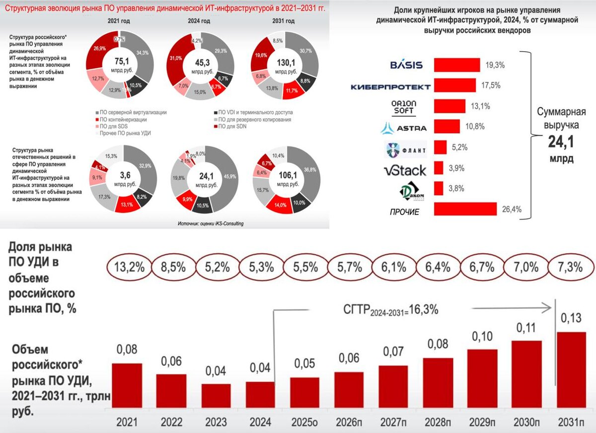 Друзья, мы с вами хорошо прокачались в различных отраслях, начиная с банковского или нефтяного, заканчивая сектором удобрений и металлургами. Понимаем денежные потоки компаний, географию продаж, экспортный потенциал и т.д. Сегодня предлагаю погрузиться в сложный, но крайне любопытный мир IT-индустрии. В руки мне попал отчет iKS-Consulting, который проанализировал сектор и выделил самый быстрорастущий сегмент. 💻 Итак, по мнению аналитиков iKS-Consulting, рынок ПО управления динамической ИТ-инфраструктурой (УДИ) способен показать опережающий рост в ближайшие годы. Прогнозируемый среднегодовой темп роста сегмента может составить 16,3% на интервале 2024-2031 гг., в то время, когда весь IT-рынок подрастет всего на 11,9%. В денежном выражении объемы УДИ вырастут почти втрое до 130,1 млрд рублей к 2031 году. УДИ является частью критически важного для реализации стратегической государственной повестки системного ПО, которое лежит в основе технологического суверенитета. Рынок УДИ включает реше
