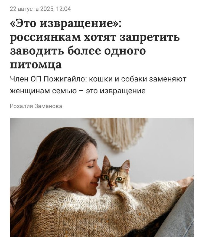 Кошатниц приравняли к извращенкам. Член Общественной палаты Павел Пожигайло обвинил женщин с питомцами в «сломленной психике» и продвижении идеологии чайлдфри. Мол, кошки и собаки у них вместо мужа и детей — угроза для «традиционных ценностей». Выход — зоопредел: не больше одной кошки и одной собаки на лицо. Видимо, чтобы потомство размножалось, а не мурлыкало.