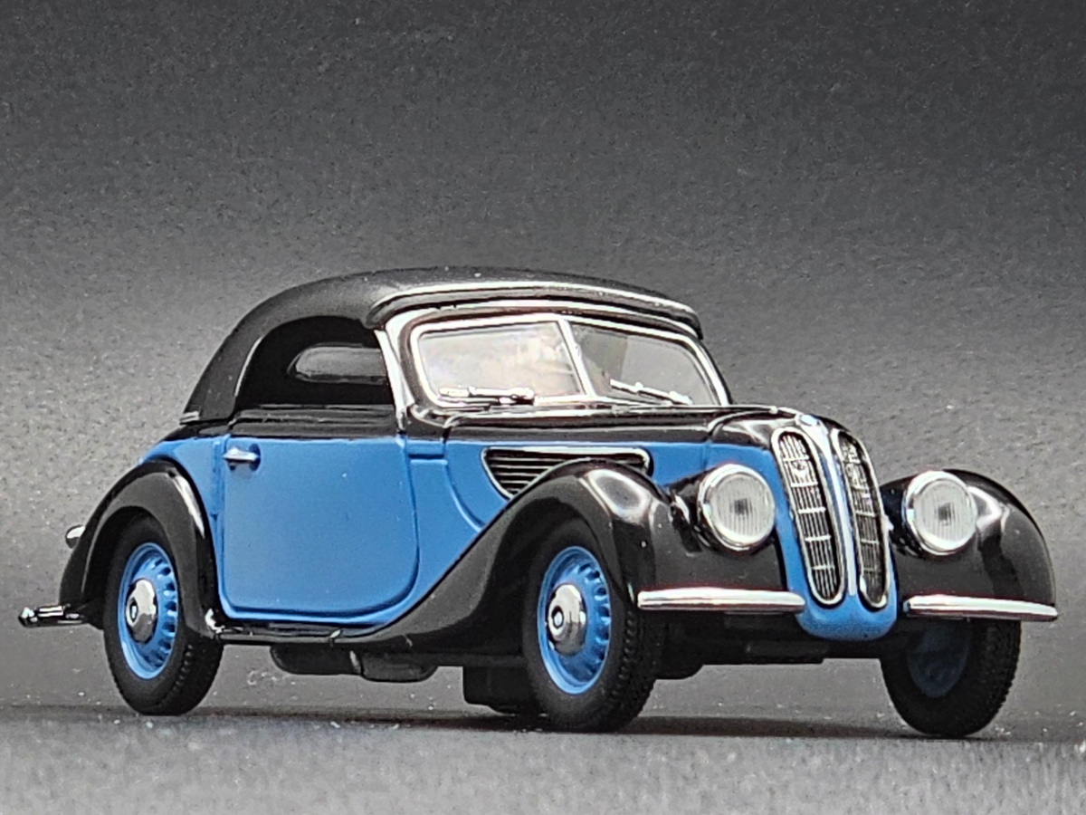 Обзор модели BMW 327 1941 With Soft Top blau/black от компании Detail Cars в масштабе 1/43. Немного о настоящем автомобиле: BMW 327 - двухдверная версия модели 326, выпускавшаяся с 1937 по 1941 гг. в кузовах купе и кабриолет с посадочной формулой 2+2. В плане дизайна она отличалась от BMW 326 более низкой поясной линией, наполовину интегрированными в передние крылья обтекаемыми фарами, одинарными половинками бамперов и широкими дверями (на передних петлях у кабриолета и на задних - у купе). Оба кузова были цельнометаллическими и строились фирмами Ambi-Budd из Берлина или Autenrieth из Дармштадта. Как правило, они красились в два цвета. Короткое шасси с колёсной базой 2750 мм было позаимствовано у младшей модели BMW 320, включая независимую переднюю подвеску на поперечной рессоре, ведущий задний мост на продольных рессорах и гидравлические барабанные тормоза. Под капотом ставился верхнеклапанный (OHV) рядный 6-цилиндровый двигатель M78 с двумя карбюраторами, объёмом 1971 см3 и мощно