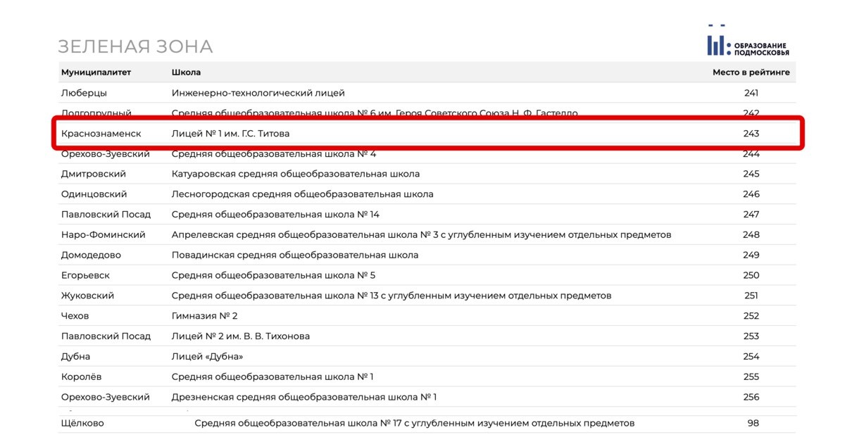 Министерство образования Московской области опубликовало рейтинг лучших школ Подмосковья 2024-2025. В список вошли все 4 школы Краснознаменска. Лицей №1 им Г.С. Титова — 243 место СОШ № 4 с УИОП им. Г.К. Жукова — 85 место Гимназия №1 — 290 место Гимназия №2 — 377 место Для сравнения напоминаем результаты прошлого года Лицей №1 им Г.С. Титова — 68 место СОШ № 4 с УИОП им. Г.К. Жукова —71 место Гимназия №1 — 233 место Гимназия №2 — 381 место