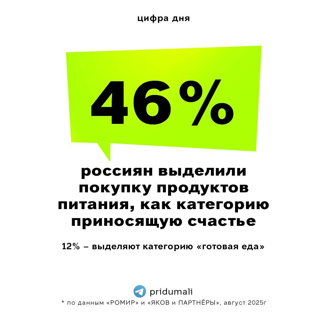 В рубрике «Цифра дня» данные от РОМИР и ЯКОВ И ПАРТНЁРЫ — 46% россиян испытывают счастье, покупая продукты питания.