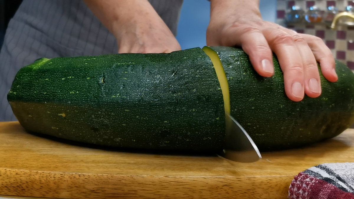 На фото у меня кабачок очень большой, но для приготовления, конечно же, нам весь он не нужен. Мы используем только часть. Остальное можно заморозить и приготовить такую штуку, например, зимой. Это будет очень даже неплохо.