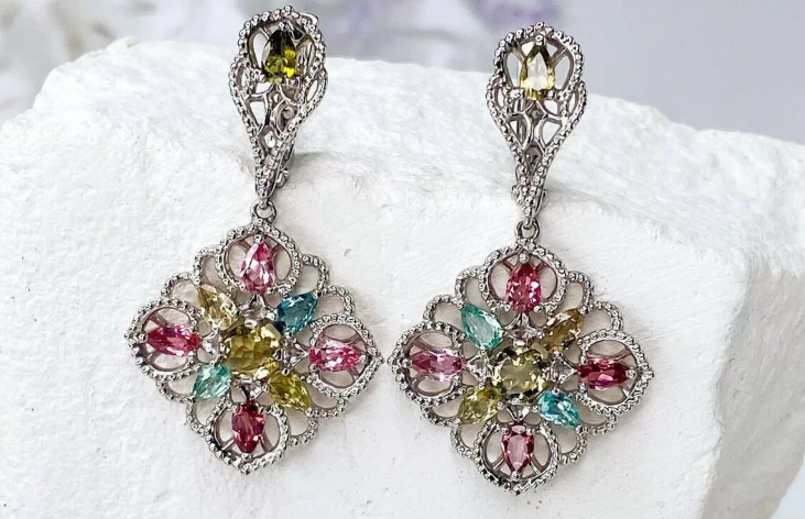 По форме сережки напоминают какие-то необычные сказочные цветы. Их поверхность усыпана разноцветными турмалинами: розовыми, голубыми, зелеными. Оттенки хорошо сочетаются между собой, делают украшения яркими, но при этом не вычурными. Благодаря грамотной огранке камни создают красивую игру света и гармонично дополняют композицию.