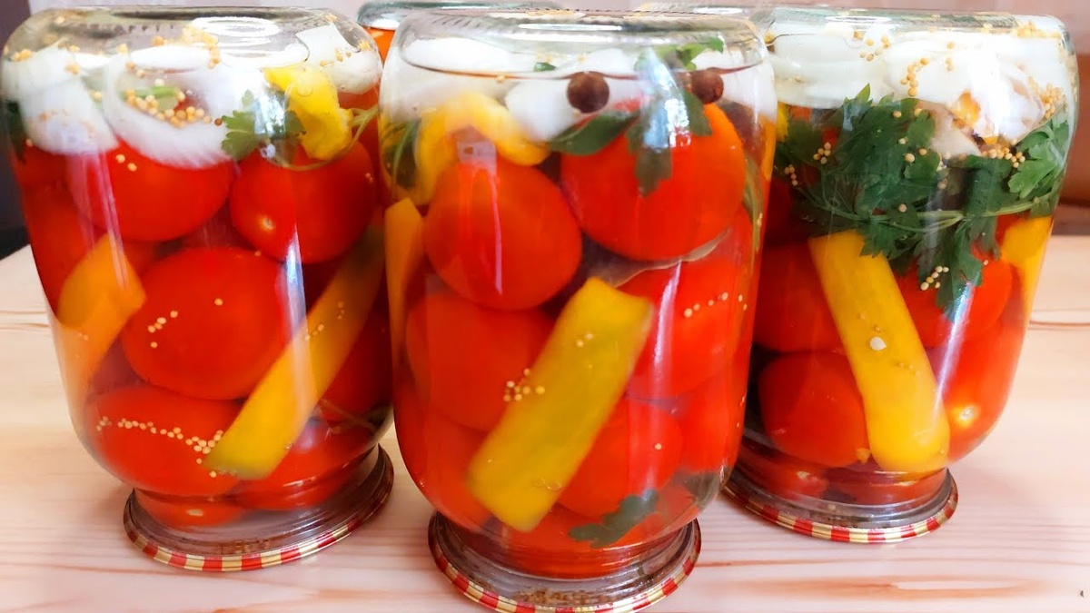 На дно кладу петрушку. И закладываю помидоры, но не до конца. Пустоты заполняю болгарским перцем. Сверху кладу ещё петрушку и добавляю помидоров. Сколько поместится?
