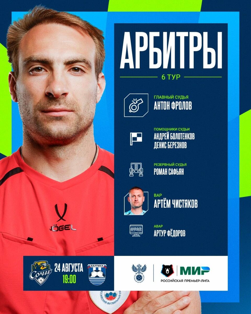 На матч «Сочи» ⚔ «Балтика» назначена следующая бригада арбитров: 🚩 Главный арбитр матча — Антон Фролов 🏳 Ассистенты судьи — Андрей Болотенков, Денис Березнов 📺 VAR — Артём Чистяков 👀 AVAR — Артур Фёдоров ✍🏻 Инспектор — Николай Иванов В качестве главного судьи Антон Вячеславович работал на 13 матчах «Балтики», в которых наша команда пять раз одержала победу и шесть раз сыграла вничью. В этих встречах было показано 27 желтых карточек.