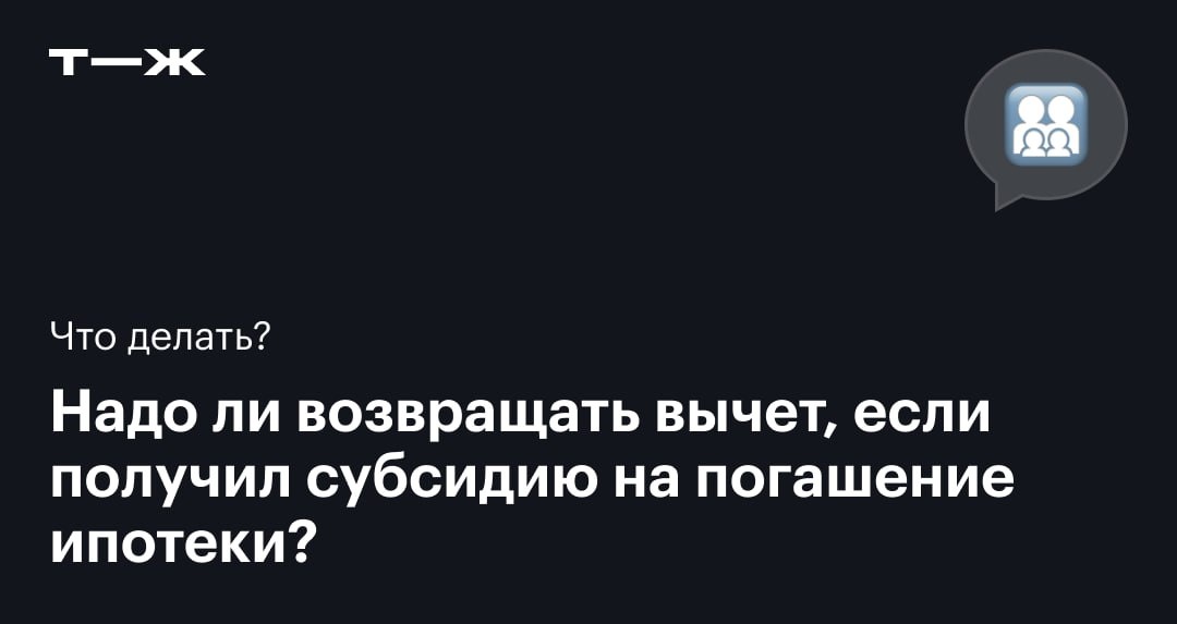 Получили налоговый вычет за покупку жилья. Позже, как многодетные, получили от государства 450 000 ₽ на погашение ипотеки. В итоге своих денег потрачено меньше на эту сумму. Надо ли возвращать вычет? Как это сделать? 😮 Разбираемся, кто имеет право на вычет за покупку жилья и в каких случаях не придется возвращать налог из-за субсидии: https://t-j.ru/d-tg/vychet-mnogodetnym
