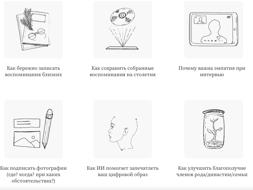 - Процесс, доступный каждому. Наша система подскажет, с чего начать и о чем спросить родных. Используйте опросники, чтобы бережно записать воспоминания старших членов семьи, не упустив ни одной важной детали.