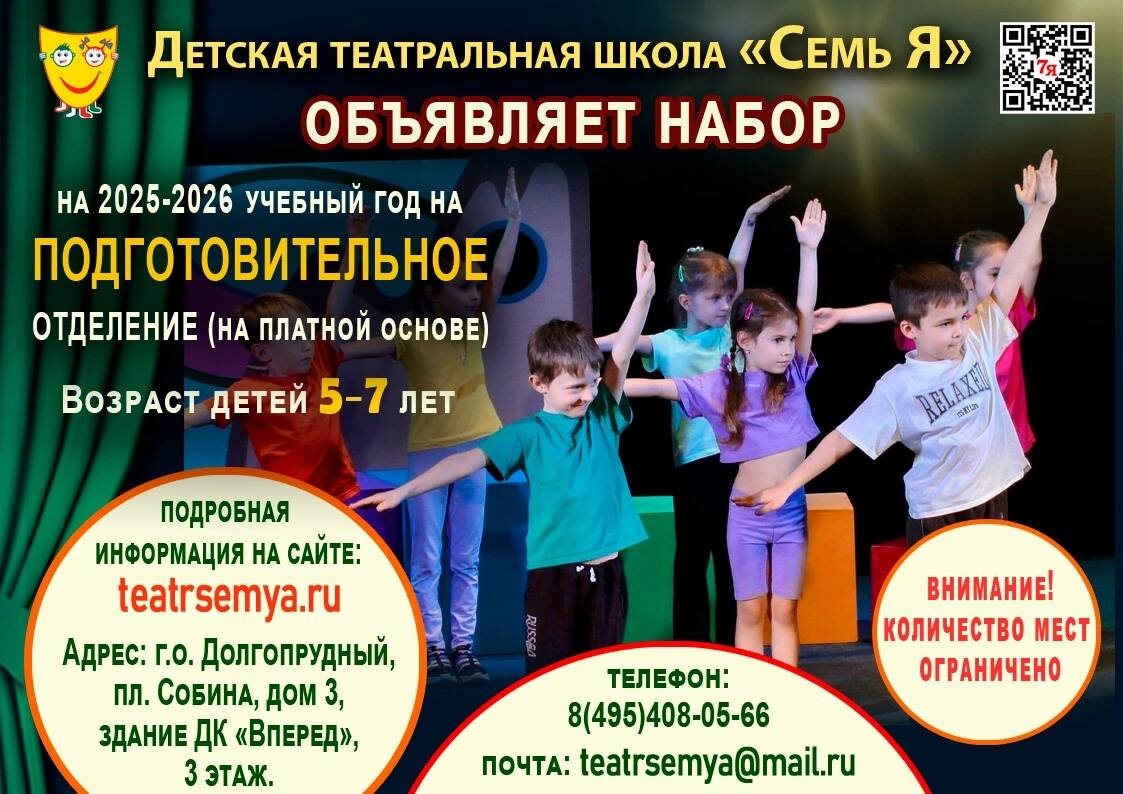 🎭Детская театральная школа «Семь Я» объявляет дополнительный набор на ПОДГОТОВИТЕЛЬНОЕ отделение Обучение по программе «ТЕАТРАЛИКИ» (дополнительная общеразвивающая программа раннего эстетического развития)🧸 Возраст на 1 сентября – 5-7 лет. Срок обучения 2 года. ❗️ПРИЕМ ЗАЯВЛЕНИЙ продлится с 20 августа по 30 сентября 2025❗️ 🔹Вступительные прослушивания на данную программу не предусмотрены Ознакомиться с подробной информацией, порядком записи и подачи документов можно на сайте teatrsemya.ru в разделе «Приём в школу»⬇️ https://teatrsemya.ru/blog/prijom_v_shkolu_na_2025_2026_uchebnyj_god/2025-07-01-420