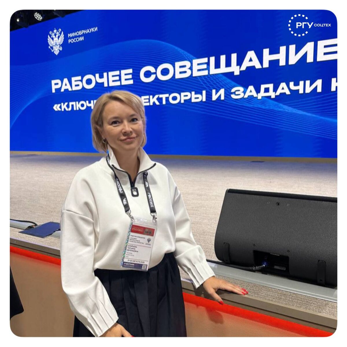 🎓 Соцтех на Всероссийском совещании «Ключевые векторы и задачи на 2025/2026 учебный год» С 21 по 23 августа на площадке Национального центра «Россия» проходит масштабное совещание для ответственных за реализацию молодежной политики и воспитательной деятельности. В работе совещания принимает участие Татьяна Агейчева, проректор по молодежной политике РГУ СоцТех. Под председательством заместителя Министра науки и высшего образования РФ Ольги Петровой более 600 участников обсуждают стратегические направления развития: 🔺 поддержку студенческих семей 🔺 патриотическое воспитание молодежи 🔺 развитие добровольчества 🔺 вопросы отдыха и оздоровления студентов 🔺 обеспечение комплексной безопасности Совещание объединяет представителей вузов со всей страны и определяет ключевые задачи, которые станут основой работы системы молодежной политики в новом учебном году. @rgusocteh
