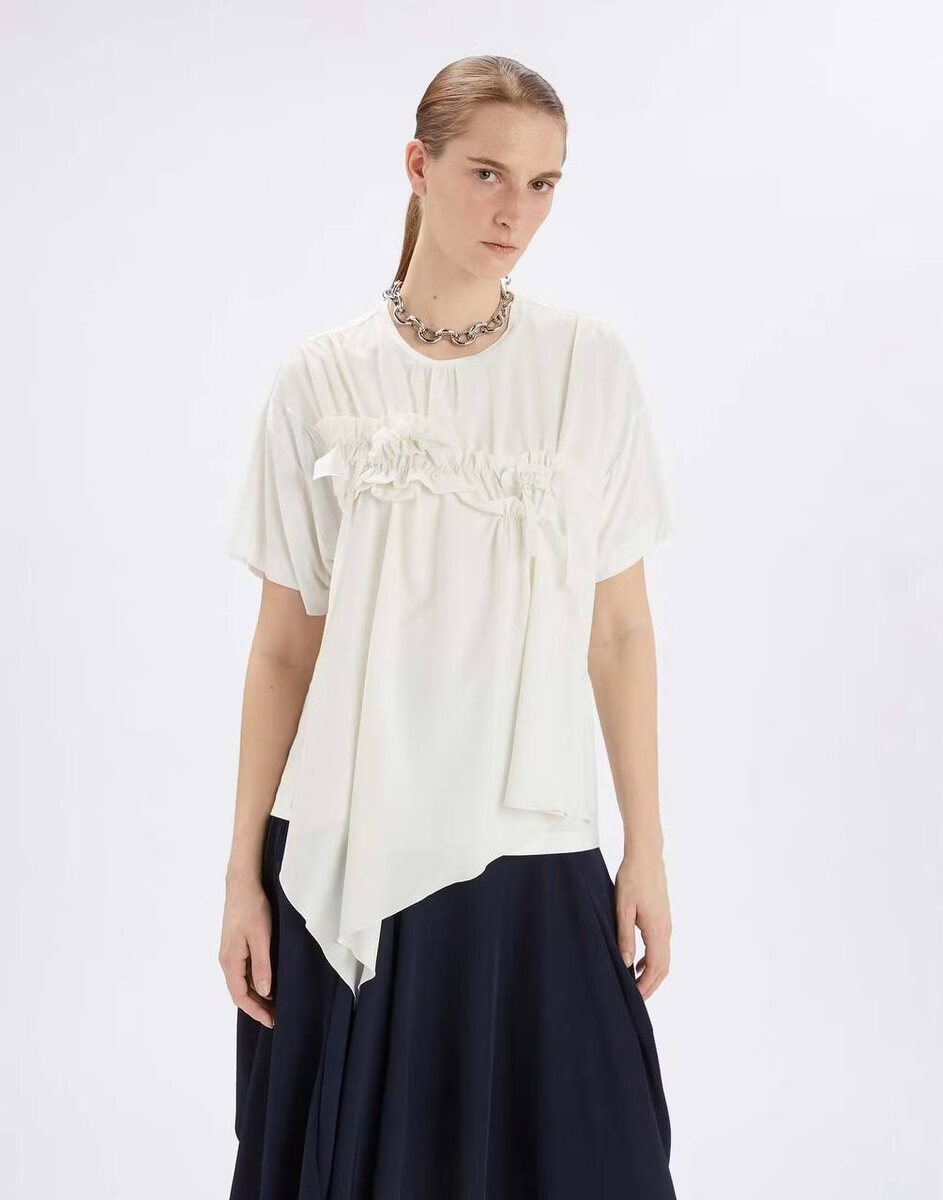 Изысканный акцент, который преобразит ваш образ🤍 Асимметричный них добавляет современный акцент и делает футболку по-настоящему уникальной. Круглый вырез и короткие рукава сохраняют универсальность, позволяя легко вписать ее в любой образ – от повседневного до вечернего. 📍Ждём вас в ТРЦ Европейский, 2 этаж.