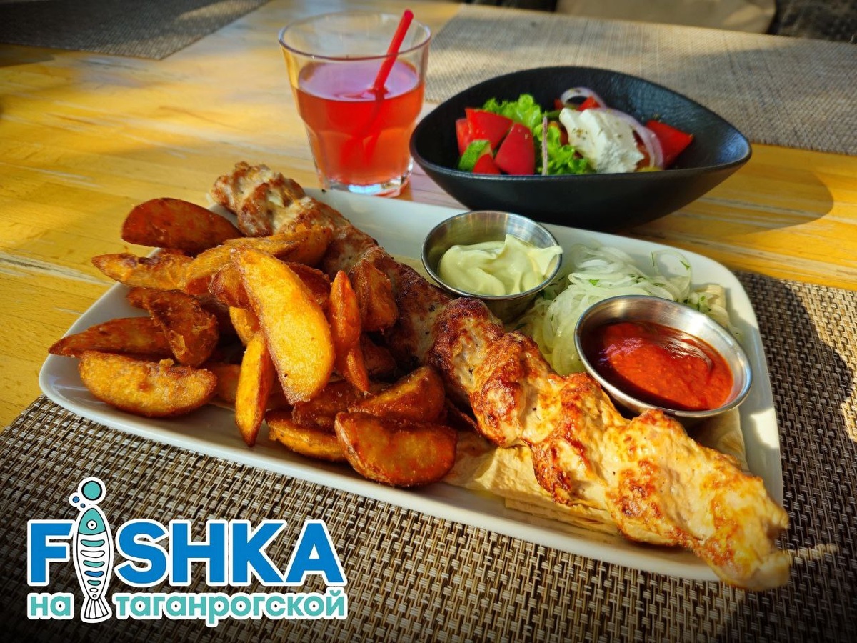 Спешите попробовать люля-кебаб из курицы, картофельные дольки, греческий салат и клюквенный морс в кафе 🐟 FISHKA на Таганрогской набережной