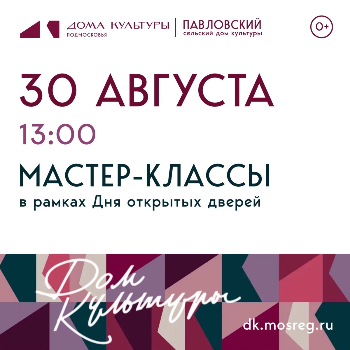 ✨ ✨ ПРО МАСТЕР-КЛАССЫ✨ 30 августа мы подготовили для вас и ваших детей замечательную программу мастер-классов: 🕒 13:00 — Фитнес для тех, кто хочет быть в форме 🕒 13:00 — Открытый урок Хора русской песни «Павловские узоры» 🕒 13:20 — Йога для души и тела 🕒 13:40 — Декоративно-прикладное творчество для детей (кружковой кабинет) 🎁 Специальное предложение: каждому участнику мастер-классов — приятный подарок! Не упустите возможность открыть для себя новые увлечения и провести время с пользой для души и тела! Ждём вас по адресу: д.Павловское, улица Вокзальная, строение 18. 📆 30.08.2025 🏢 Павловский сельский дом культуры (СДК) 📍 г.о.Домодедово, дер.Павловское, ул.Вокзальная, д.18 ✅ Мероприятия Домодедово https://dzen.ru/id/66f10385cc4c5a16f7b5fb02 http://vk.com/domodedovo_events http://dzen.ru/domodedovo_events