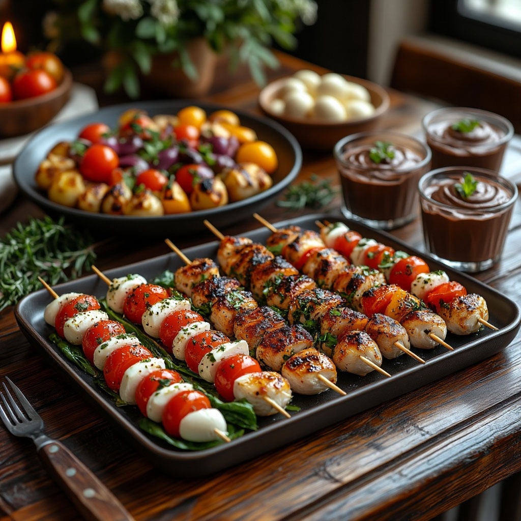 1. Закуска: Капрезе на шпажках с бальзамическим глазуром и базиликом