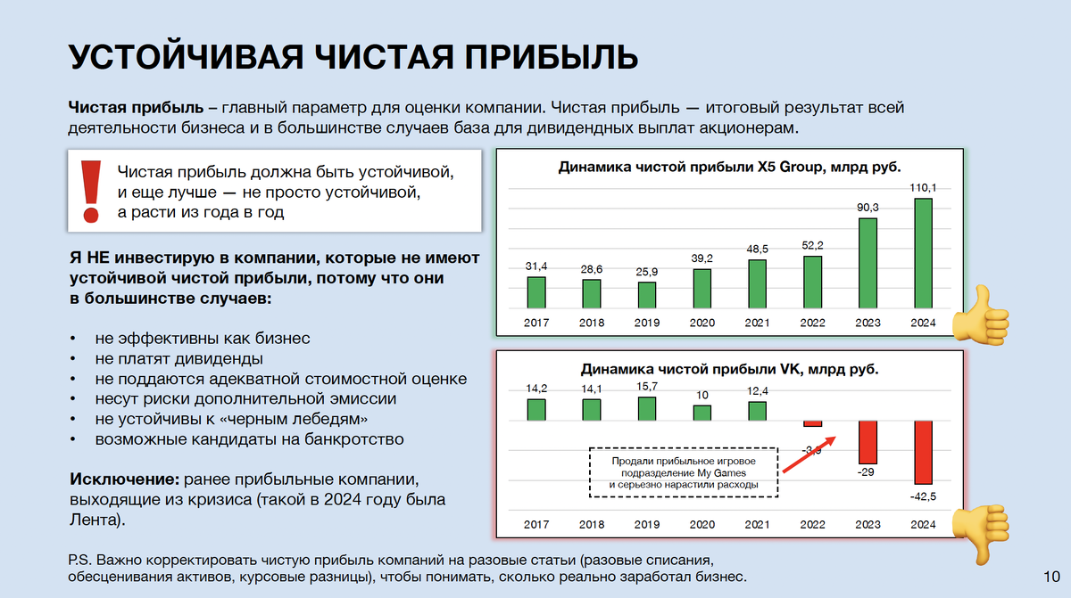 Друзья, ставку в сентябре могут снизить и до 16% (5 недель дефляции и слабые отчеты по всему рынку — веские причины для этого). Снижение ставки приведет к падению доходностей вкладов и фондов денежного рынка. Меня и моих коллег-инвесторов знакомые уже спрашивают: «Скоро заканчиваются вклады, доходность там уже ниже, есть что купить из акций, чтобы получить больше?». Рынок зачем-то торгует мир, покупая Газпром, Новатэк и СПБ Биржу (и продавая их же, когда очередной заход на мир не удался). На мой взгляд, торговать нужно ставку. Чем ниже будет ставка, тем дороже будут акции, и особенно акции качественных компаний - бенефициаров снижения ставки. Сезон отчетов в самом разгаре. Анализировать отчетность и искать идеи — вам поможет моя методичка по фундаментальному анализу «10 принципов отбора лучших компаний». Что вы узнаете из методички: 👍 Какие показатели в отчетах — главные для оценки компаний; 👍 Все о ключевых мультипликаторах, как их правильно считать и использовать – P/E, P/FCF, PEG,