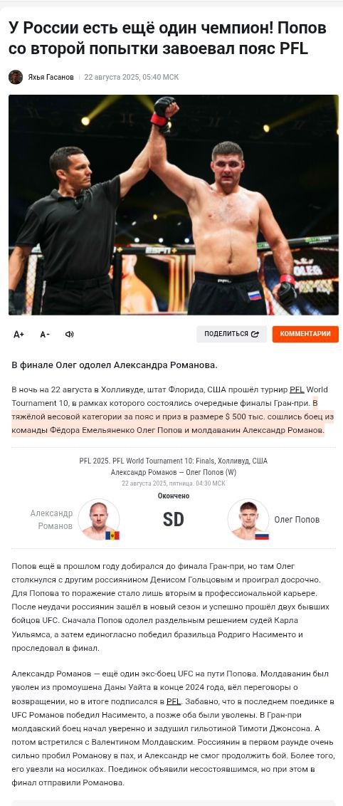 Российский боец ММА из команды Фёдора Емельяненко родом из Республики Калмыкия Олег Попов стал чемпионом турнира PFL World Tournament 10. Бой проходил в ночь с 21 на 2ц августа в городе Холливуд (не путать с Голливудом "фабрикой грёз), штат Флорида, США. © Чемпионат https://www.championat.com/boxing/article-6134258-oleg-popov-aleksandr-romanov-pfl-world-tournament-10-final-gran-pri-pfl-kto-pobedil-obzor-poedinka-rezultaty.html