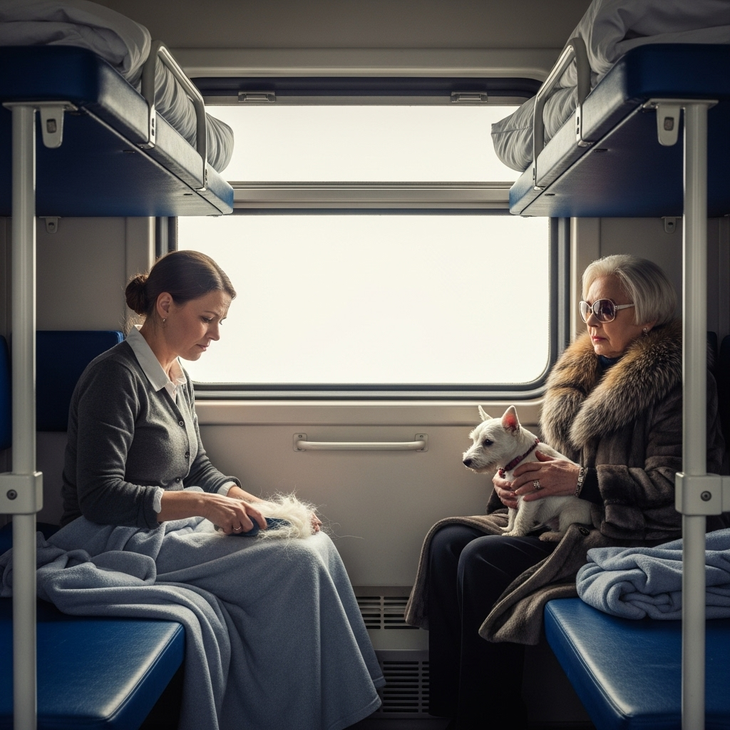 Подхожу к 22-му месту и… офигеваю. На моей нижней полке, прямо на подушке, лежит собака. Белоснежный терьер, породистый, в розовом ошейнике с блёстками. Лапы на моём пледе, мордочка на подушке. Спит, как дома.