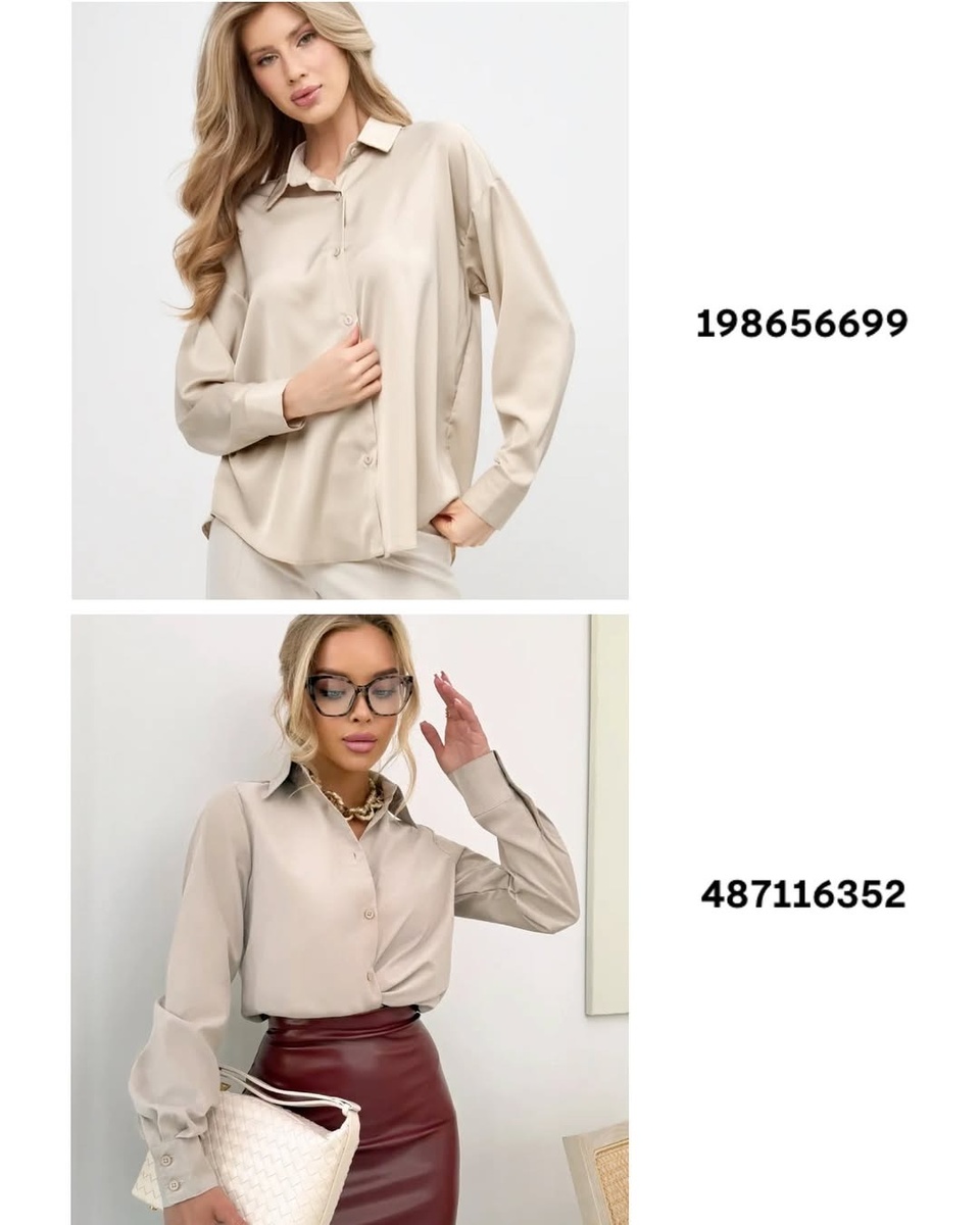 Beige mood — это не «скучный нюд», а палитра дорогих, светящихся оттенков песка, таупа и латте. Такие рубашки работают круглый год: к джинсам, костюмам, кожаным юбкам и даже к шортам. Ниже — строго по порядку артикулов с фото: что за модель, как сидит, куда носить и как стилизовать.
