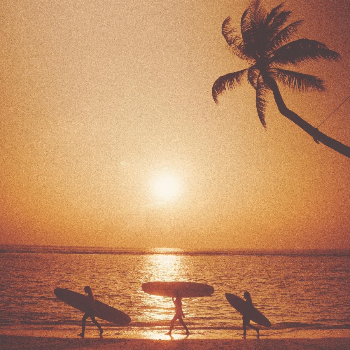 Закат, трое с досками, всё очень по делу. Победная простота: передний план с тёплой полосой прибоя, фигуры раскладываются метрономом, справа наклонённая пальма как знак географии. Кадр рассказывает не о спорте, а о ритуале возвращения. Никакой трагедии, просто хороший день завершился.