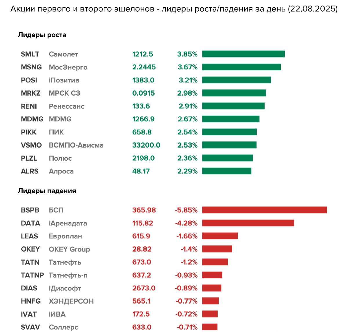 Всем привет! По итогам основной сессии 22 августа индекс Московской биржи прибавил 0,5%. Валюта по отношению к рубля потихоньку укрепляется: Нефть торгуется около 68 долларов за баррель. Совет директоров Банка Санкт-Петербург рекомендовал дивиденды в размере 16 руб. 61 коп./ао (ДД: 4,5%) и 22 коп./ап (ДД: 0,3%). Совет директоров Новатэка рекомендовал дивиденды за 1п 2025 года в размере 35,5 руб/акция (ДД: 3%). 25 августа совет директоров Займера решит по дивидендам за 1п 2025 г. 25 августа совет директоров Газпром нефть решит по дивидендам. 27 августа 2025 года совет директоров «Полюс» решит по дивидендам 29 августа совет директоров Озон Фармацевтики решит по дивидендам за 1п 2025 г. Сегодня без сделок. Поставьте лайк и не забывайте подписываться на наш канал «Настоящий Миллионер» в телеграме, чтобы получать информацию еще быстрее, также можно поддержать автора оформив за 100 рублей в Дзене Премиум подписку, которая даст доступ к "закрытым" публикациям. А что сегодня покупали вы?