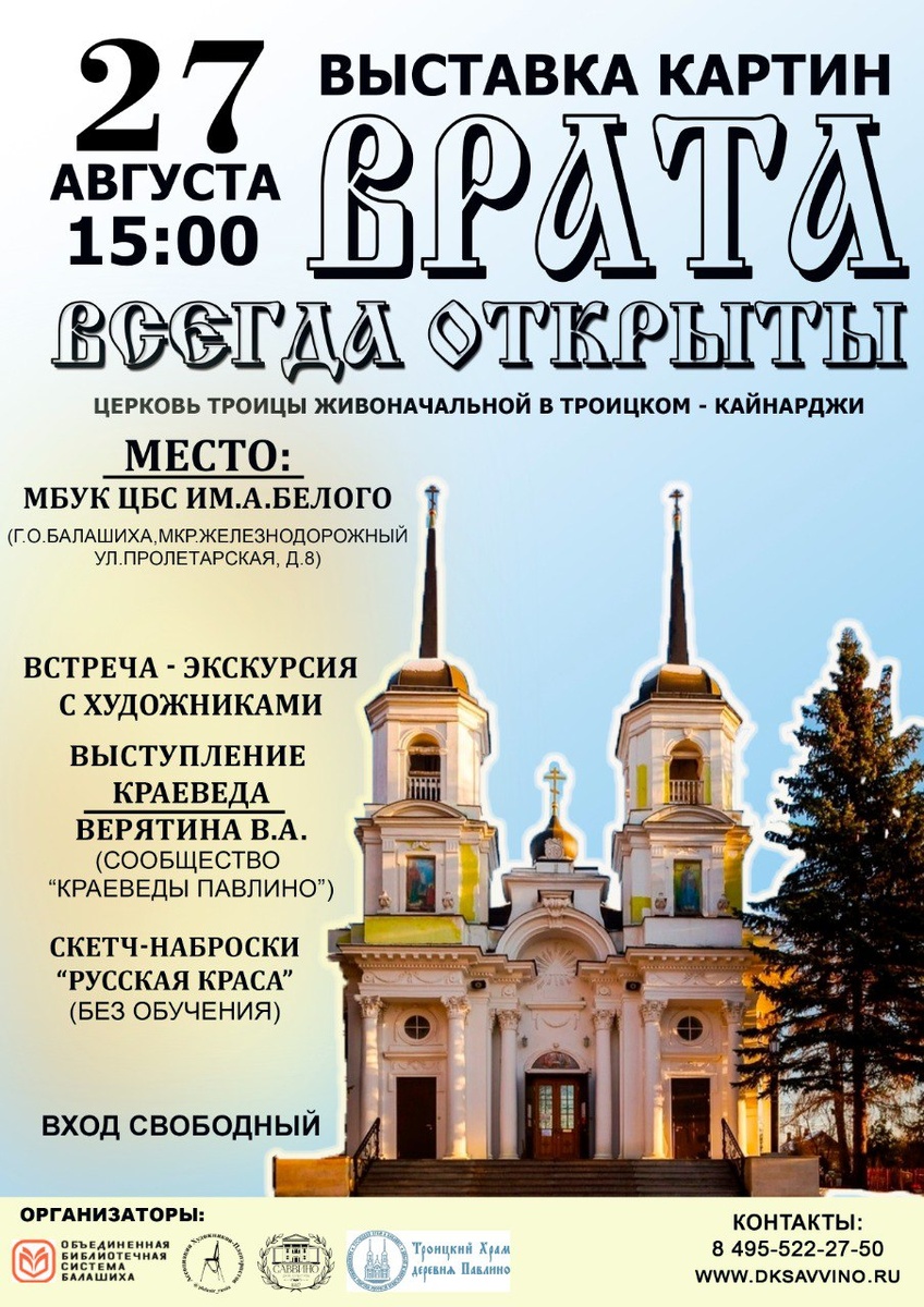 Открытие выставки картин "Врата всегда открыты. Троицкий храм в Павлино" 27 августа в 15:00 мы приглашаем вас стать свидетелями торжественного открытия выставки картин, посвященной одному из самых живописных и значимых мест Подмосковья – Троицкому храму в Павлино. В программе: - Встреча-экскурсия с художниками: Погрузитесь в творческую атмосферу, узнайте о замыслах авторов и их видении храма. - Выступление краеведа: Верятина Валентина Александровна, глава краеведческого сообщества "Краеведы Павлино", поделится интересными фактами об истории храма и его значении для региона. - Скетч-наброски "Русская краса" без обучения: Попробуйте себя в роли художника! Независимо от вашего опыта, это прекрасная возможность создать свой собственный шедевр в компании профессионалов. Эта выставка – это уникальная возможность прикоснуться к прекрасному, расширить свой кругозор и просто хорошо провести время в теплой и творческой атмосфере. Присоединяйтесь к нам! Вход свободный.