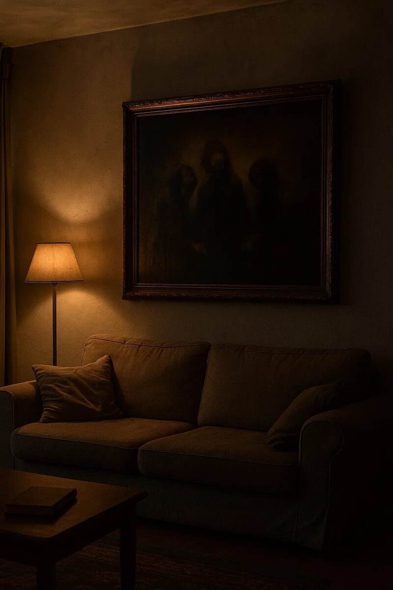Однажды ночью я проснулся от ощущения, что в квартире кто-то есть. Звуков не было — только это липкое чувство чужого присутствия. Я прошёлся по комнатам, проверил дверь, окна — всё закрыто. В гостиной задержался дольше: лунный свет падал прямо на картину.