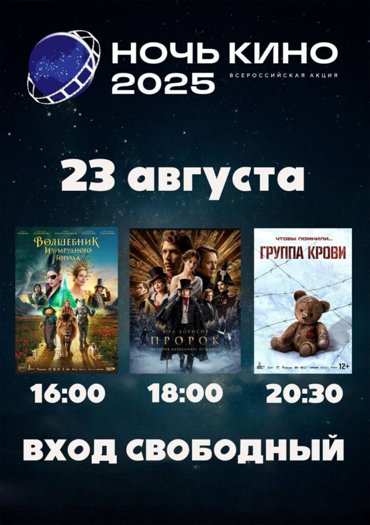 В Краснодарском крае «Ночь кино» проведут с 23 на 24 августа одновременно на 400 площадках В рамках юбилейной 10-й акции в учреждениях культуры и кинотеатрах региона покажут популярные отечественные фильмы, представят развлекательную программу. – Этот праздник стал доброй традицией, объединяющей нас любовью к отечественному кинематографу. В этом году мы приготовили особенную программу, чтобы каждый смог открыть для себя новые, вдохновляющие грани нашего киноискусства, – отметила министр культуры краснодарского края Виктория Лапина, пригласив жителей и гостей Кубани принять участие в акции. В программе «Ночи кино 2025» – военная драма «Группа крови» в честь 80-летия Великой Победы и хиты российского кинопроката «Волшебник Изумрудного города. Дорога из желтого кирпича» и «Пророк. История Александра Пушкина». Также на 400 культурных площадках во всех муниципальных образованиях края проведут киновикторины, тематические экскурсии, концерты, мастер-классы, выступят артисты. В Краснодаре свою