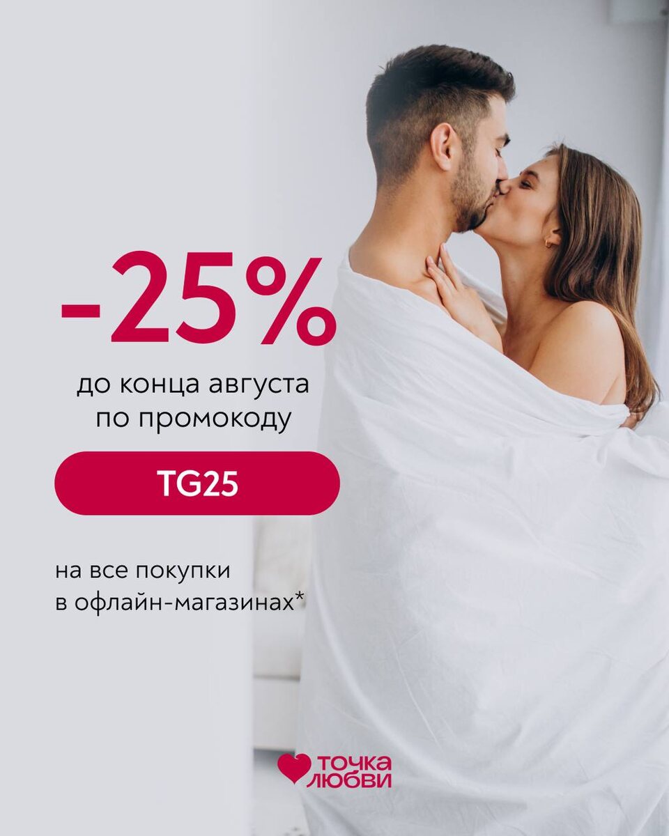 Лето заканчивается, но это не повод для грусти! Точка Любви приготовила для тебя подарок — скидка 25% на весь ассортимент и заряд хорошего настроения! 🎉 Акция действует на все покупки в офлайн-магазинах* Точки Любви по промокоду TG25❣️ Не упусти шанс порадовать себя и своего партнера — скидка действует до 31 августа включительно. Приходи, выбирай, получай удовольствие! *Список магазинов, участвующих в акции