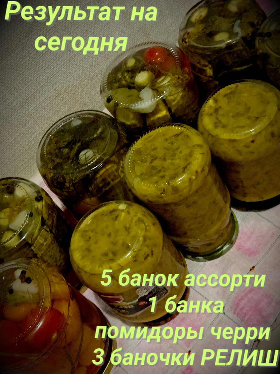 Ну вот на сегодня моя алхимия завершена! На часах 22:30. Пять баночек ассорти : огурчики и помидорчики черри. Одна баночка с разноцветными черри ( жёлтые и красные) И три баночки соуса РЕЛИШ. Сегодня огурчики терла на тёрке, остальное нарезала мелким кубиком, а сладкий перец взяла зелёного цвета. Остроты добавила поменьше и результат мне тоже понравился. Думаю такой соус будет вкусно использовать , когда буду готовить домашнюю шаурму. 🤔 Ну и с чувством выполненного долга я отхожу ко сну. 🥱 Всем спокойной ночи и сладко- зефирных снов!!! 🤗