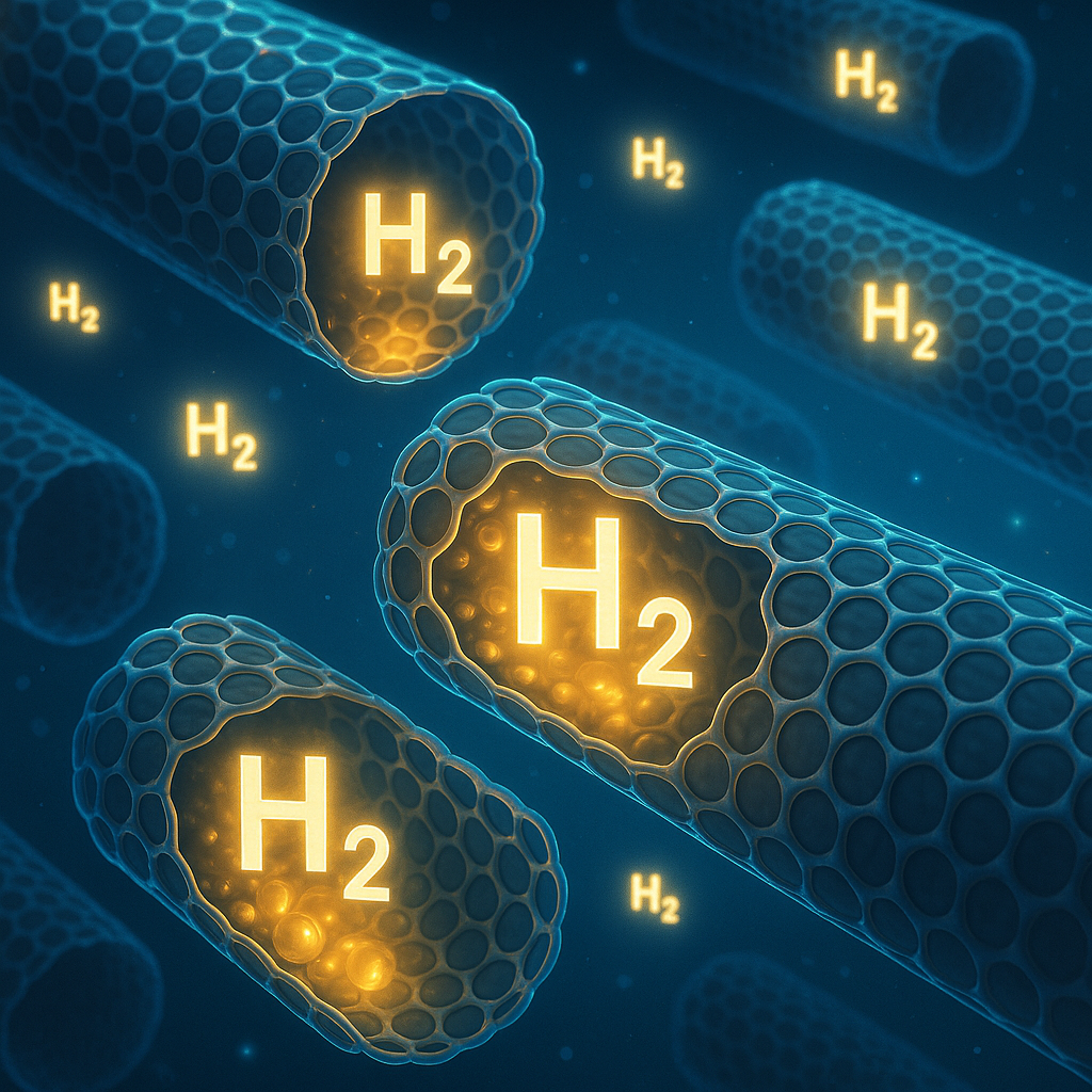 Водород называют «топливом будущего»: при его сгорании образуется лишь вода, и он может хранить огромные запасы энергии. Однако есть проблема: водород сложно безопасно и компактно хранить. Он просачивается через большинство материалов, а в жидком виде требует низких температур. Недавно учёные предложили инновационный подход: удерживать водород внутри углеродных нанотрубок. Эти трубки — структуры толщиной в несколько атомов, обладающие потрясающей прочностью и уникальными свойствами. Внутри углеродной нанотрубки пространство настолько малое, что молекулы водорода плотно упаковываются, словно шарики в колоду. Молекулы удерживаются благодаря силам Ван‑дер‑Ваальса и не могут проникнуть через стенки трубки. В отличие от сжижения, газ при этом остаётся в газовой фазе, что упрощает процесс. Учёные синтезировали массивы нанотрубок, связали их в пучки и наполнили водородом при умеренном давлении. Получилось плотность хранения, сопоставимая с жидким водородом, но без необходимости охлаждения. Та