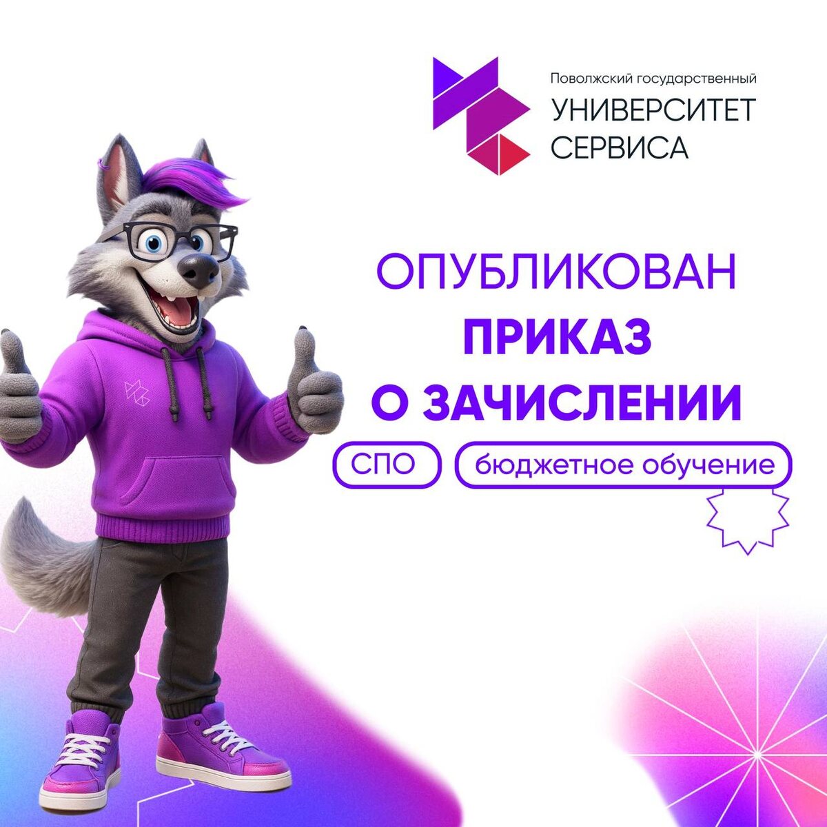 🐺Маскот Университета сервиса сегодня особенно рад, ведь на то есть причина! 🔥На нашем сайте опубликован приказ о зачислении абитуриентов очной формы обучения на бюджетные программы СРЕДНЕГО ПРОФЕССИОНАЛЬНОГО ОБРАЗОВАНИЯ! 🎉С этого дня вы - СТУДЕНТЫ Университета сервиса! Поздравляем с новым статусом и ждём вас в стенах Университета сервиса! До скорой встречи впереди студенческая жизнь, которая запомнится надолго!
