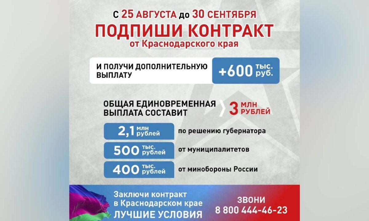 Таким образом при подписании контракта с Минобороны от Краснодарского края размер выплаты составит 2,1 млн рублей вместо 1,5 млн рублей. В итоге военнослужащие – участники СВО при подписании контракта с 25 августа до 30 сентября включительно от любого из муниципалитетов Кубани получат в совокупности 3 млн рублей.